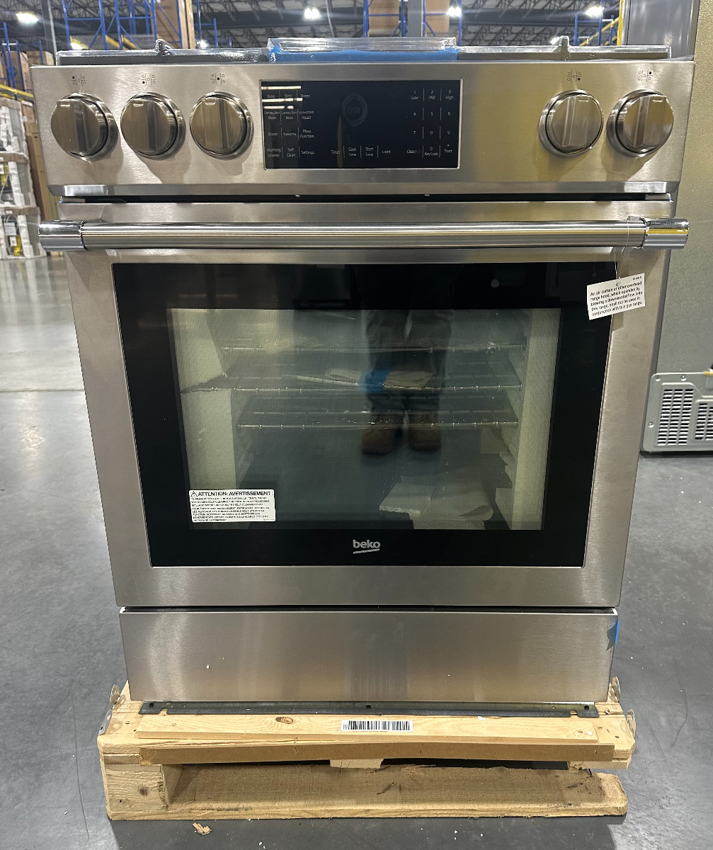 With features like easy-read InnovaChef Smart Display, interior halogen lighting, easy-to-clean enamel burners, and automatic gas safety shutoff, this Beko 30” range is every home cook’s dream. Its roomy 5.7 cu. ft. oven is equipped with 3 heavy-duty oven racks, including a telescopic lower rack, for safe and easy handling of your heaviest dishes and cookware. Enjoy extra space below for baked goods and side dishes inside a full-extension warming drawer.